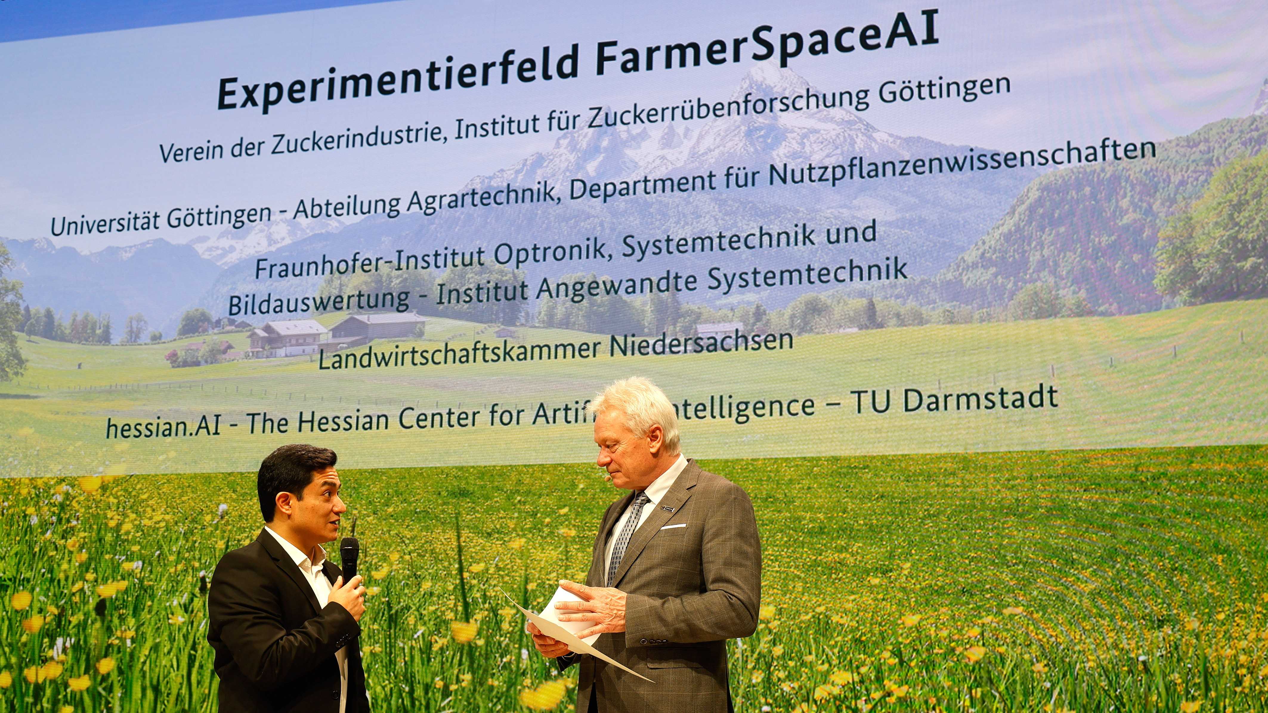 Göttingen, 20.01.2026 - Am Montag wurde im Rahmen der Grünen Woche der Förderbescheid für das neu bewilligte Projekt „FarmerSpaceAI“ übergeben. Dr. Abel Barreto vom IfZ nahm den Bescheid vom Bundesminister für Landwirtschaft, Ernährung und Heimat, Alois Rainer, entgegen und beantwortete Fragen zu den Projektzielen und Optionen für einen verbesserten Pflanzenschutz.